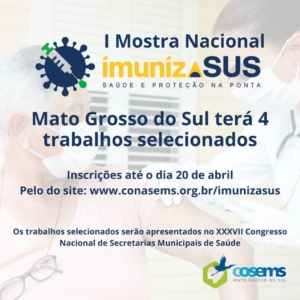As inscrições podem ser feitas até 20 de abril, pela Plataforma ImunizaSUS acessível em www.conasems.org.br/imunizasus. Mato Grosso do Sul terá 4 trabalhos selecionados, sendo 1